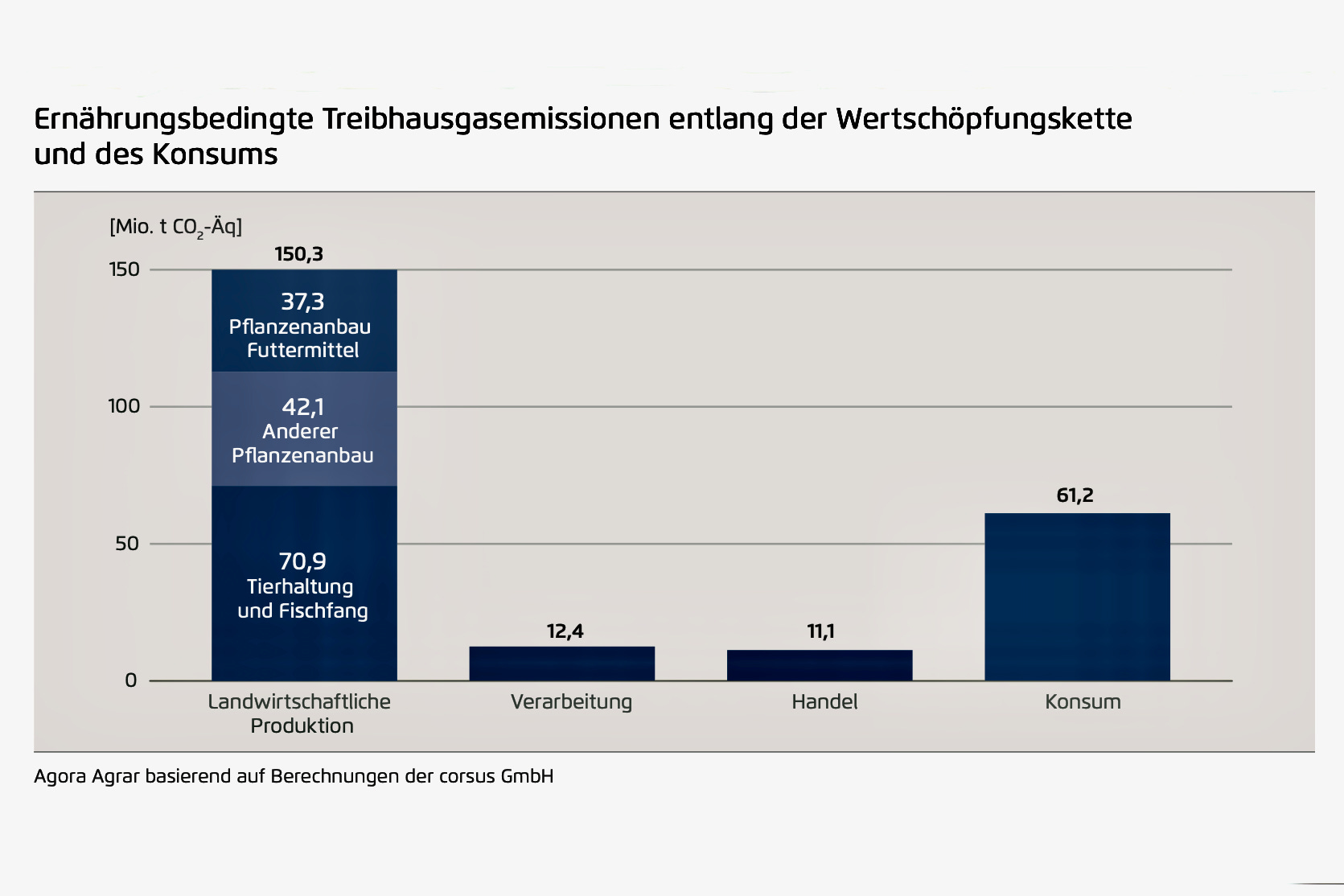 Agora Agrar schaute dabei nicht nur auf die Landwirtschaft, sondern auf die gesamte Wertschöpfungskette. Von den vorgelagerten Betriebsmitteln der Landwirtschaft (Dünger, Diesel etc.) über die nachgelagerte Produktion, Verarbeitung und Handel bis zum Konsum in den Haushalten. Auch Moore und andere vorgelagerte Effekte wurden einbezogen.