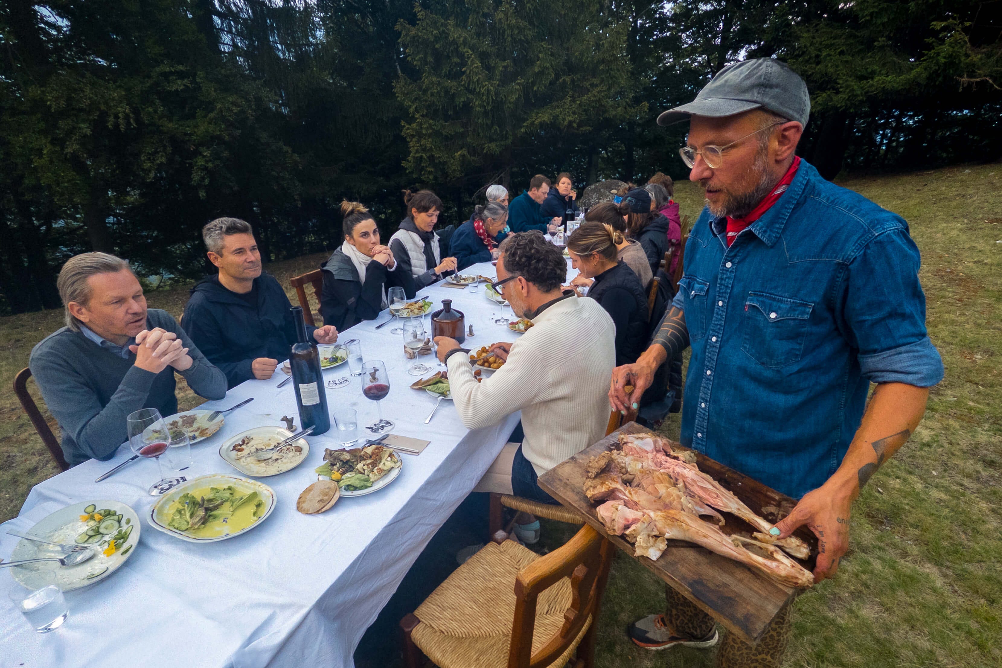 Dann kommt Simon vom Feuer im Küchen-Rustico hinaus zur Tavolata, die mitten auf der Wiese steht: Schon die beiden Fleisch-Gänge vom Fleisch der eigenen Ziegen sind eine Offenbarung. Das Gitzi-Gigot (Hinterbein oder Schlegel) ist mager, zart und fleischig – das beste Bratenstück vom Zicklein.