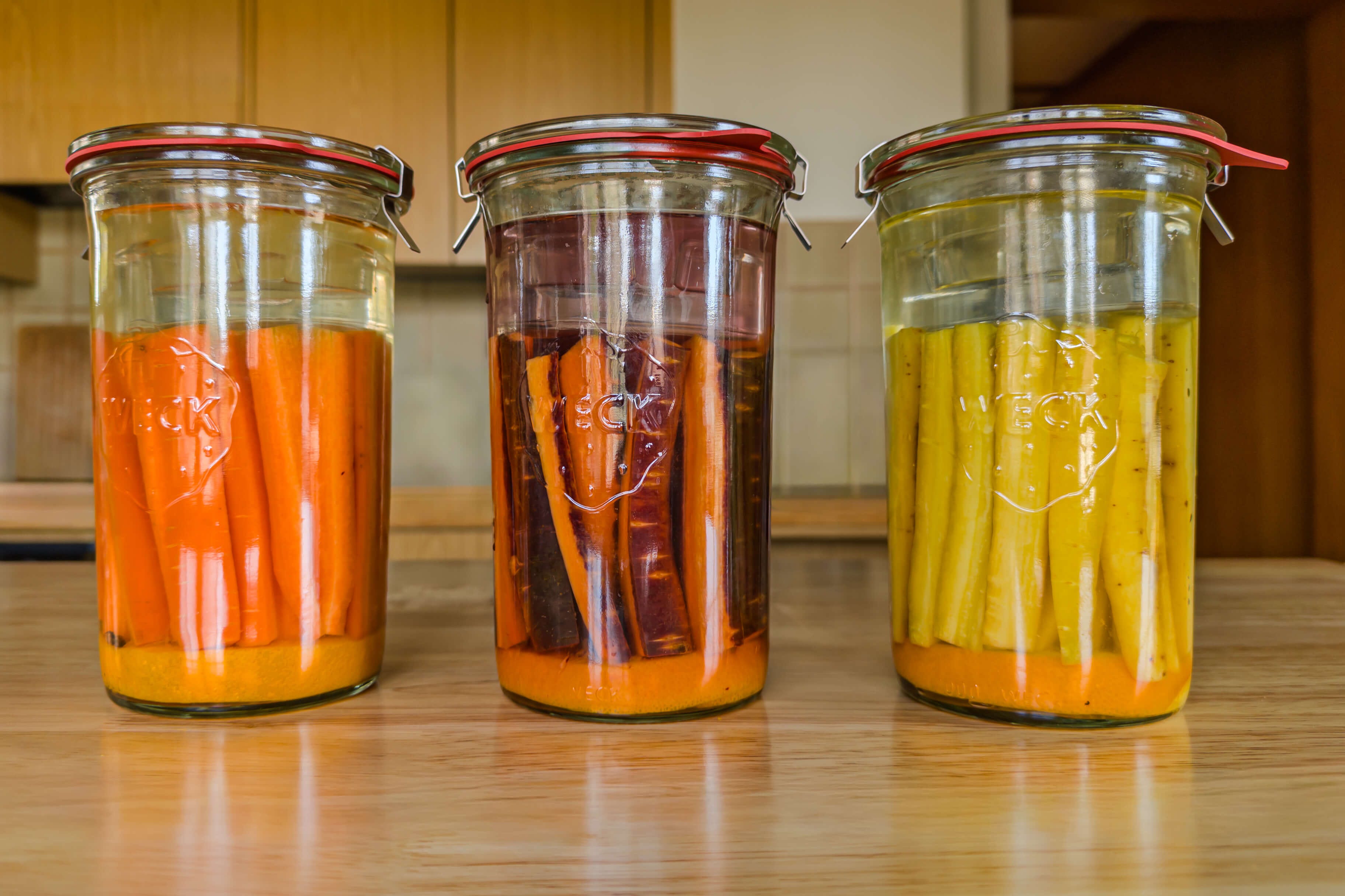 From my kitchen cupboard I pull out three one-liter jars of fermented carrot sticks. Three days ago they were just carrots sitting in salt brine: firm, a little sweet, bright orange.